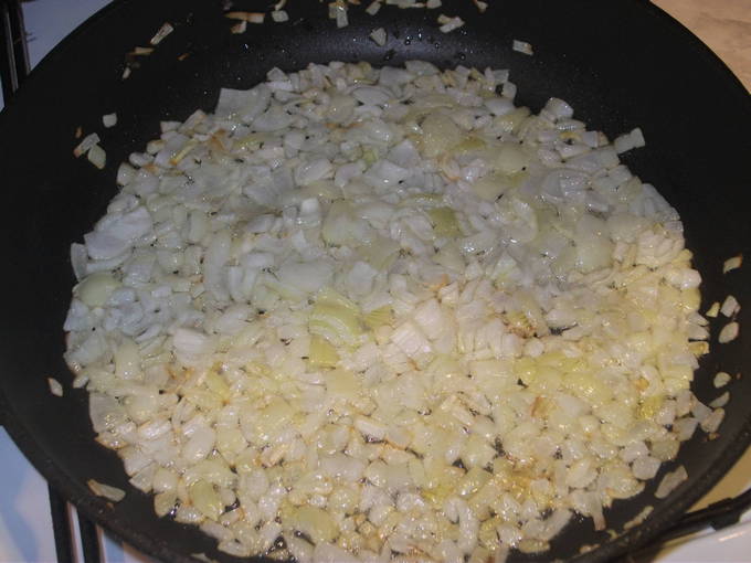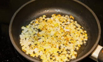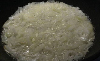 We reinigen en snijden de ui van elke vorm: je kunt hem hakken, of je kunt hem in langwerpige plakjes snijden. We nemen een koekenpan, bevochtigen deze met plantaardige olie en leggen de reeds gesnipperde ui erop. Bak enkele minuten op middelhoog vuur.