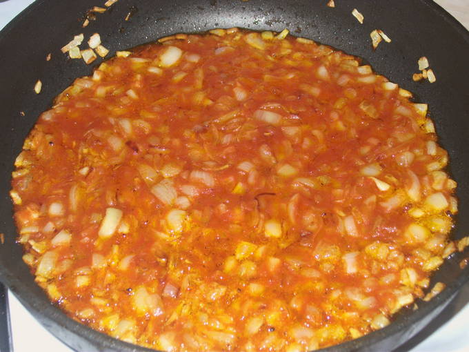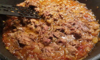- Doe de tomatenpuree in de gebakken uien en voeg ook suiker en zout toe. Voeg na een paar minuten de stoofpot uit de pot toe aan de ui en demonteer deze in stukjes zodat de stoofpot zich over het hele gebied van de pan bevindt. Voeg wat water toe dat overblijft na het koken van pasta.
