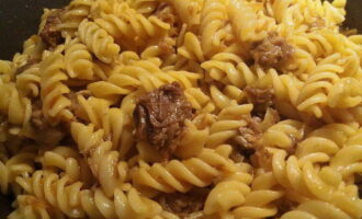 - Verdeel na een paar minuten de stoofpot over de ui en meng. We kijken naar pasta, ze staan op het punt klaar te zijn.