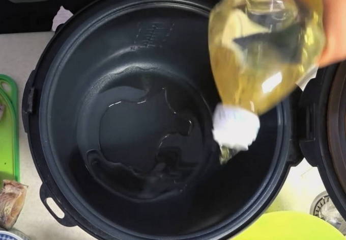 - Giet wat plantaardige olie in de droge kom van de multicooker en selecteer de modus "Fry". Laat de olie opwarmen.