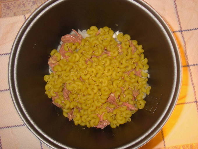- Voeg na het geluidssignaal de pasta toe, bestrooi met kruiden en zout. Goed mengen. Voeg wat kokend water toe. Het moet boven het niveau van de pasta komen om het volledig te bedekken. We sluiten het deksel van de multicooker en starten de "Pilaf" -modus.