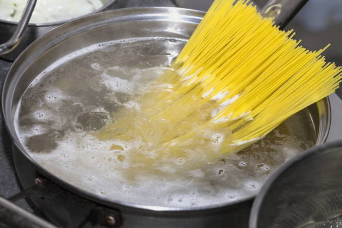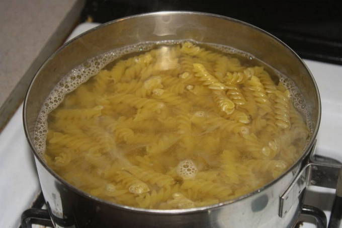 - We verzamelen een pot water en zetten het op het vuur, wachten tot het kookt. Giet pasta in het reeds gekookte water, roer voor de eerste keer, kook tot het gaar is. Voor elk type pasta is de kooktijd individueel: je kunt het op de verpakking verdrinken.