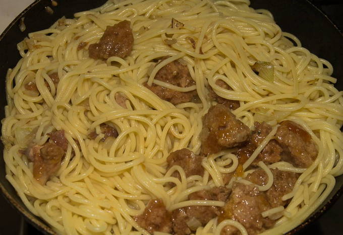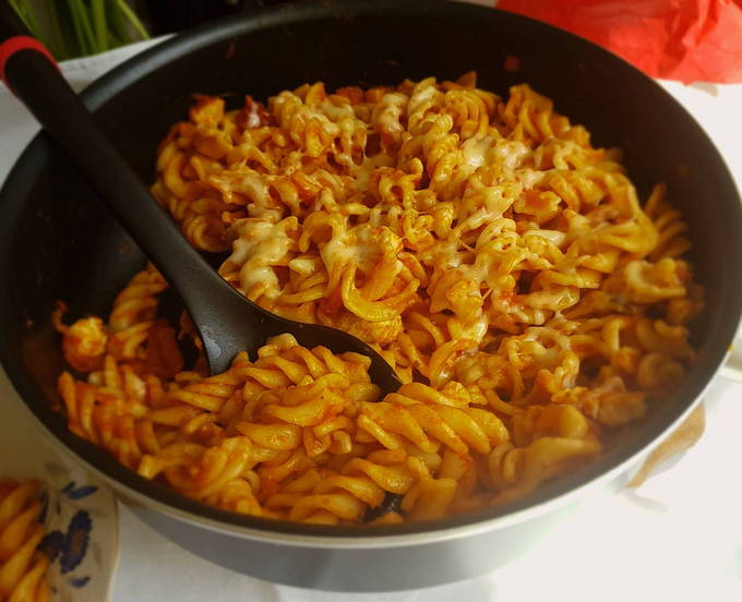 - Voeg de gekookte pasta toe aan dezelfde pan, meng goed, dek af met een deksel en laat 3-5 minuten sudderen. Daarna is ons gerecht eindelijk klaar. Je kunt het serveren met kruiden, verschillende sauzen of ketchup. Eet smakelijk!