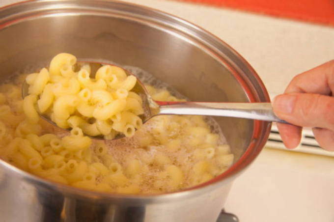 - We verzamelen een pot water en zetten het op het vuur, wachten tot het kookt. Giet pasta in het reeds gekookte water, voeg wat zout toe, roer voor de eerste keer, kook tot het gaar is. Voor elk type pasta is de kooktijd individueel: je kunt het op de verpakking verdrinken. De pasta kan worden gecontroleerd op gereedheid door de hechting aan de pot wanneer u hem uit het water haalt.