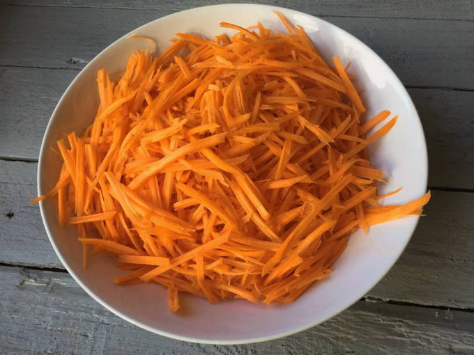 - Verwarm een met plantaardige olie ingevette koekenpan voor. Doe wortelen en stoof erop, meng, verdeel over het hele gebied van de pan, voeg je favoriete kruiden toe. Bak tot ze gaar zijn.