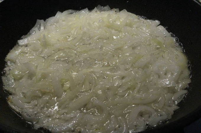 We reinigen en snijden de ui van elke vorm: je kunt hem hakken, of je kunt hem in langwerpige plakjes snijden. We nemen een koekenpan, bevochtigen deze met plantaardige olie en leggen de reeds gesnipperde ui erop. Bak enkele minuten op middelhoog vuur.