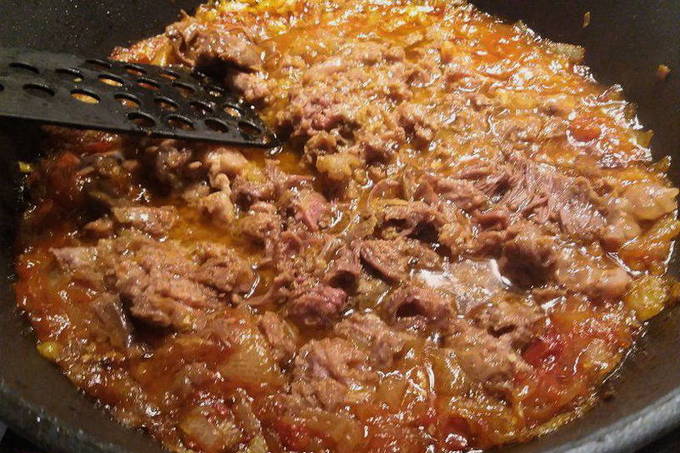 - Doe de tomatenpuree in de gebakken uien en voeg ook suiker en zout toe. Voeg na een paar minuten de stoofpot uit de pot toe aan de ui en demonteer deze in stukjes zodat de stoofpot zich over het hele gebied van de pan bevindt. Voeg wat water toe dat overblijft na het koken van pasta.