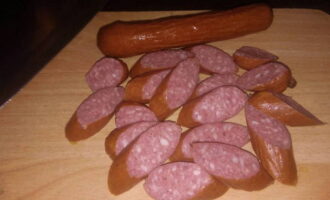 Neem je favoriete worstjes of die in de koelkast. Het lekkerste in dit gerecht is het gebruik van jachtworsten, deze geven een bijzondere rooksmaak en geur. Snijd ze in langwerpige cirkels op een snijplank.
