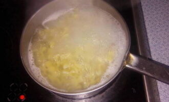 Doe water in een kleine pan en zet het op het vuur om te verwarmen. Zodra de vloeistof kookt, zout deze en voeg een lepel plantaardige olie toe. Deze kleine trucjes zorgen ervoor dat de pasta niet aan elkaar plakt, zelfs nadat deze is afgekoeld. Giet de items in een pan en kook tot ze gaar zijn. De kooktijd staat op de verpakking en is afhankelijk van het soort pasta. Je kunt producten van elke vorm nemen, het belangrijkste is dat ze van durumtarwe zijn.