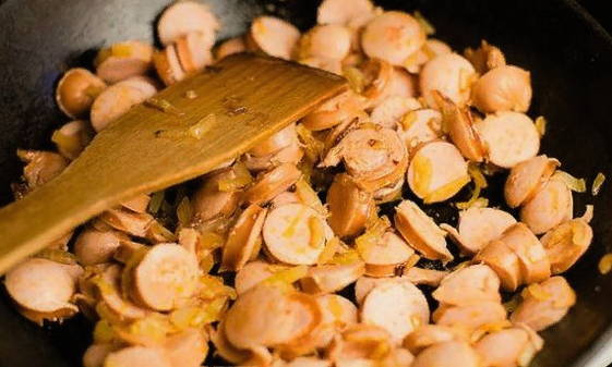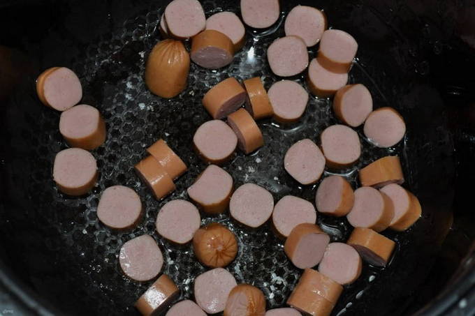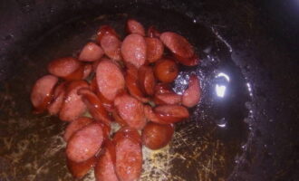 - Snijd de worstjes in kleine plakjes. De verscheidenheid aan vleesproducten speelt geen grote rol, neem degene die je lekker vindt. Voeg ze toe aan een koekenpan met uien en voeg kruiden toe: chili en paprika. Bak aan beide kanten goudbruin.