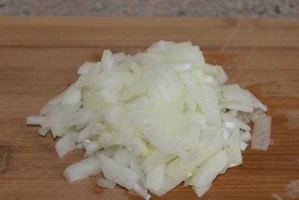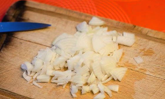 - Schil de ui en spoel hem af onder stromend water. Snijd de groente in kleine blokjes. Verhit een koekenpan ingevet met plantaardige olie en stuur gehakte uien om te bakken. Bak 3-4 minuten tot ze goudbruin zijn.