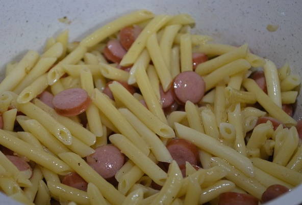 Doe gekookte pasta in een pan met vleesproducten en roer. Verwarm het gerecht op laag vuur en peper. Het gerecht is klaar! Serveer direct terwijl het heet is. Voeg eventueel ketchup of mayonaise toe.