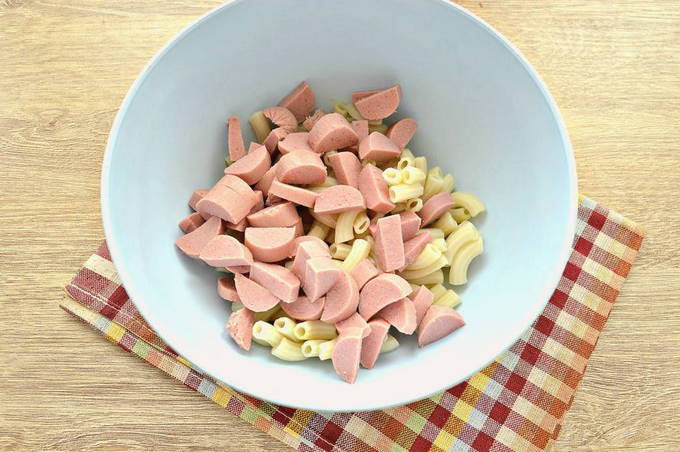 - Om stoofschotels te maken, heb je gekookte pasta nodig. Als je ze van de laatste maaltijd hebt, neem ze dan. Zo niet, doe dan koud water in een pan en steek het in brand. Als het kookt, breng op smaak met zout en een beetje plantaardige olie. Het is belangrijk om dit nu meteen te doen, zodat de gelaste producten niet aan elkaar plakken. Stuur de pasta naar de pot en kook gedurende de tijd die op de verpakking staat aangegeven. Zeef ze door een vergiet en doe ze in een kom. Snijd de worstjes in kleine stukjes.