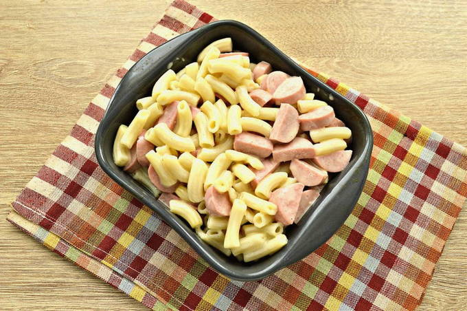 - Rasp harde kaas op een grove rasp. Strooi het over pasta en worstjes. Bak 15-20 minuten in een voorverwarmde oven op 180 graden. Snijd de voorbereide braadpan in porties en leg ze op vlakke borden. Serveer met je favoriete saus of verse groenten.