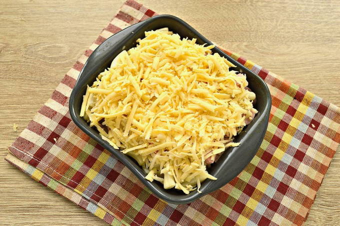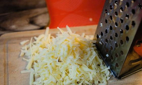 - Rasp harde kaas op een grove rasp. Strooi ze over de toekomstige braadpan.