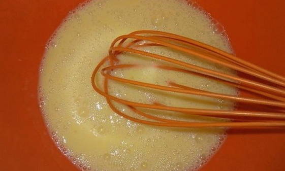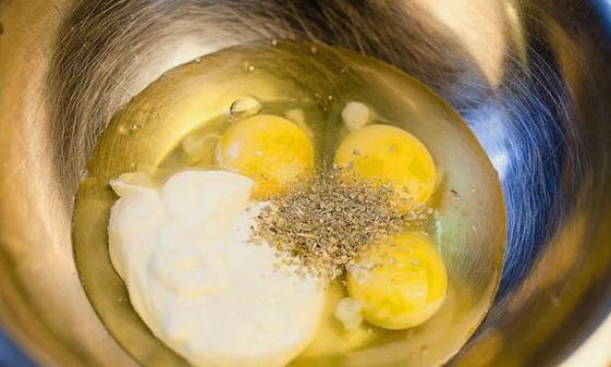 - Breek de eieren in een diepe kom, voeg zure room, oregano en zout toe. Meng alle ingrediënten grondig. Dit gaat het handigst met een garde.