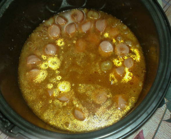 - Schil de worstjes uit de folie en snijd ze in kleine, maar niet heel dunne cirkels. Plaats ze in een multicooker-kom die is ingevet met plantaardige olie. Selecteer de modus "Braaden" of "Bakken" en gril de worstjes 10 minuten met het deksel open. Roer af en toe met een houten spatel. Voeg na 7 minuten vanaf het begin van het koken tomatenpuree of klassieke ketchup toe aan de worsten. Breng op smaak met peper en zout en je kunt naar eigen smaak kruiden toevoegen, zoals paprika. Kook de rest van de tijd.