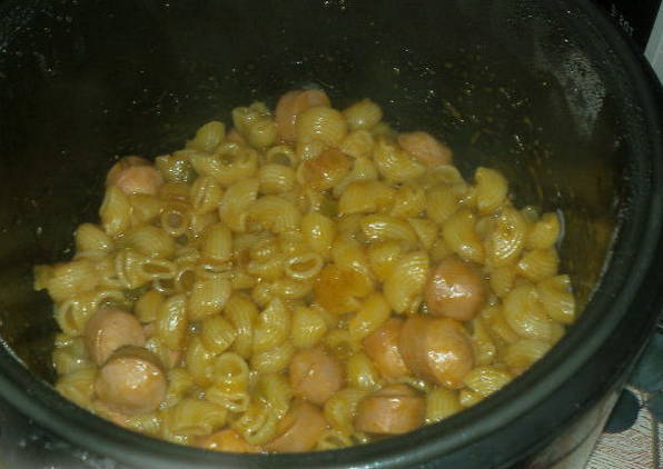 - Open het deksel van de multicooker en meng de inhoud grondig. Serveer direct terwijl het heet is. Maak een salade van verse groenten met zure room voor de pasta en worstjes.