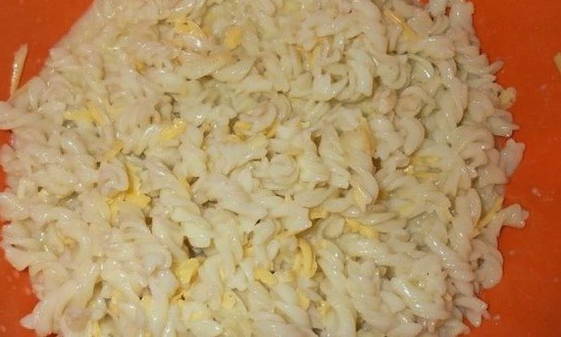 - Kook water in een pan, voeg zout toe. Stuur durumtarwepasta om daar te koken. Producten kunnen elke vorm hebben: schelpen, hoorns of spiralen. Kook ze gaar binnen de op de verpakking aangegeven tijd. Het hangt af van het soort pasta, maar duurt meestal niet langer dan 10 minuten. Gooi ze weg in een vergiet en laat het water weglopen. Breng de gekookte pasta over in een grote kom. Rasp harde kaas op een grove rasp. Giet het bij de pasta en roer. Giet het ei- en melkmengsel over de inhoud van de kom en roer opnieuw.