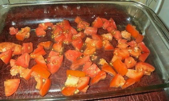 - Was de tomaten onder stromend water. Snijd een tomaat in grote blokjes en snijd de tweede in halfronde stukken. Leg de in blokjes gesneden groente op de bodem van een ovenvaste ovenschaal.