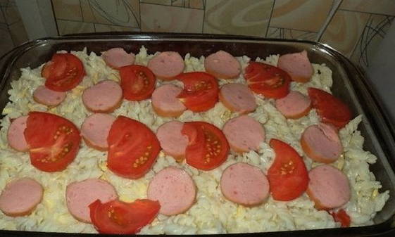 - Rasp de harde kaas op een grove rasp. Je kunt de meest voorkomende nemen, of je kunt degene nemen die goed rekt tijdens het bakken, bijvoorbeeld suluguni. Het is naar jouw smaak. Bestrooi de macaroni en worstjes met kaas.