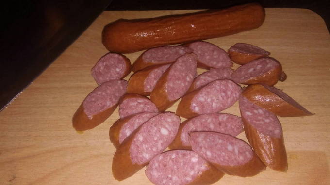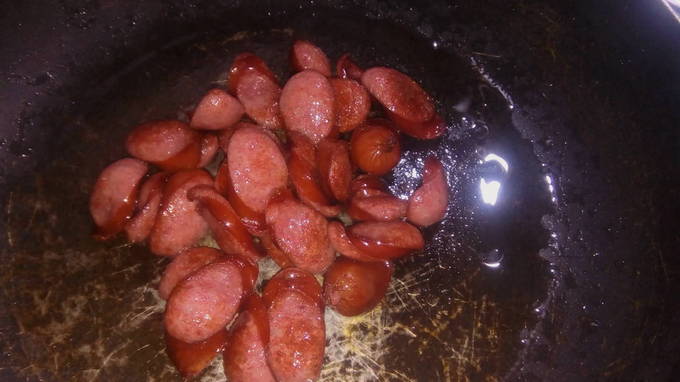 - Snijd de worstjes in kleine plakjes. De verscheidenheid aan vleesproducten speelt geen grote rol, neem degene die je lekker vindt. Voeg ze toe aan een koekenpan met uien en voeg kruiden toe: chili en paprika. Bak aan beide kanten goudbruin.