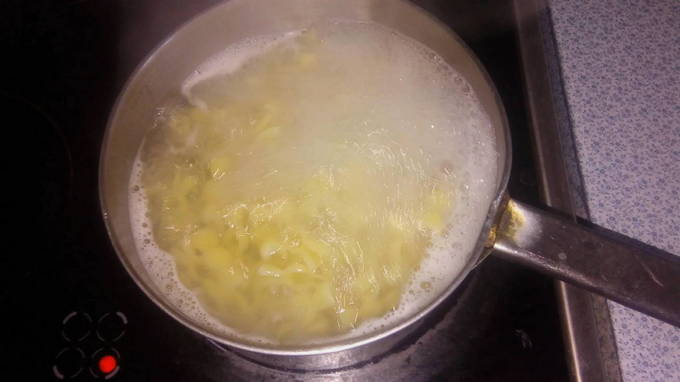 Doe water in een kleine pan en zet het op het vuur om te verwarmen. Zodra de vloeistof kookt, zout deze en voeg een lepel plantaardige olie toe. Deze kleine trucjes zorgen ervoor dat de pasta niet aan elkaar plakt, zelfs nadat deze is afgekoeld. Giet de items in een pan en kook tot ze gaar zijn. De kooktijd staat op de verpakking en is afhankelijk van het soort pasta. Je kunt producten van elke vorm nemen, het belangrijkste is dat ze van durumtarwe zijn.