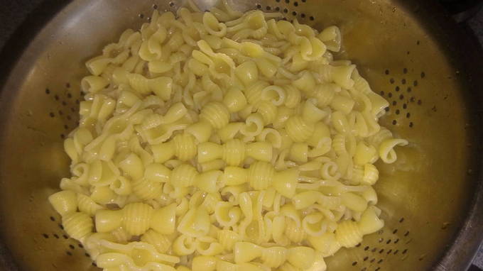 Gooi de gekookte pasta weg in een vergiet, laat de vloeistof weglopen en spoel de producten af onder stromend water. Het is niet nodig om de pasta af te spoelen, dat is aan jou.