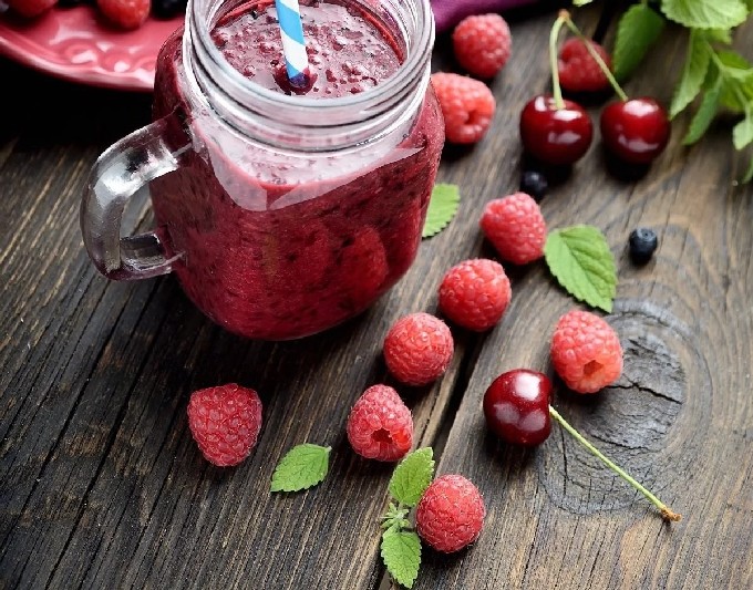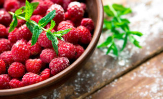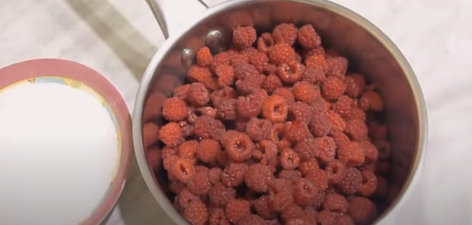 - We sorteren en wassen de frambozen zorgvuldig en laten het water weglopen. Doe de frambozen in een kom, bestrooi met suiker, dek af met een servet en laat een nacht staan om sap te vormen.