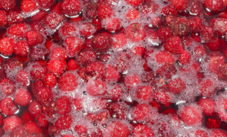 - We zetten het weer op een klein vuurtje. We verwijderen het schuim helemaal van boven, zonder de bessen aan te raken, en brengen aan de kook. Voeg frambozen toe, verhoog het vuur tot matig. Zodra het kookt, kook je het 5 minuten op laag vuur.