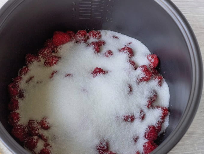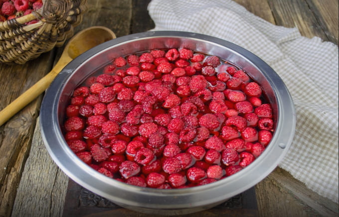 - We maken de frambozen schoon van puin, verwijderen de stelen. Giet in een geëmailleerde kom, waarin we de jam zullen bereiden. Het is belangrijk dat het kookgerei een brede bodem heeft. Voeg water en kristalsuiker toe. Meng alles en zet enkele uren in, dek af met een handdoek of gaasje, zodat de frambozen het sap eruit laten.