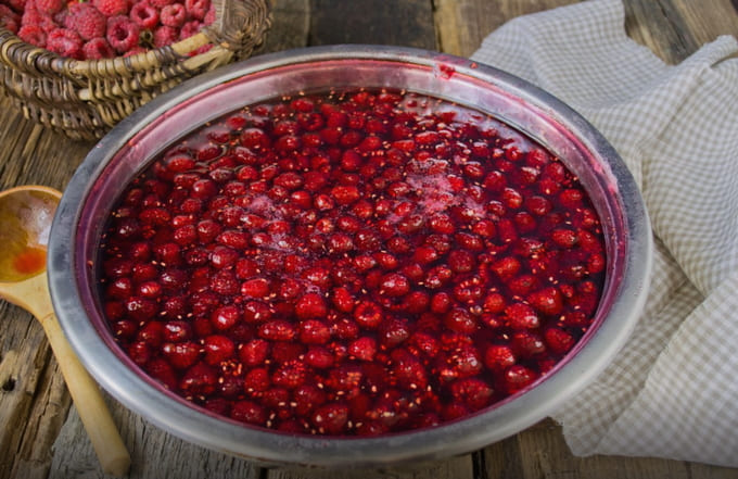 - We schuiven de frambozen in een geëmailleerde kom, gieten suiker in verschillende lagen. Dek af met een handdoek en laat 5 uur op kamertemperatuur staan tot de bessen voldoende sap hebben afgegeven, of een nacht op een koele plaats.
