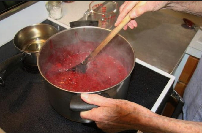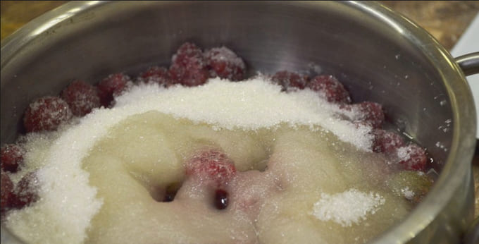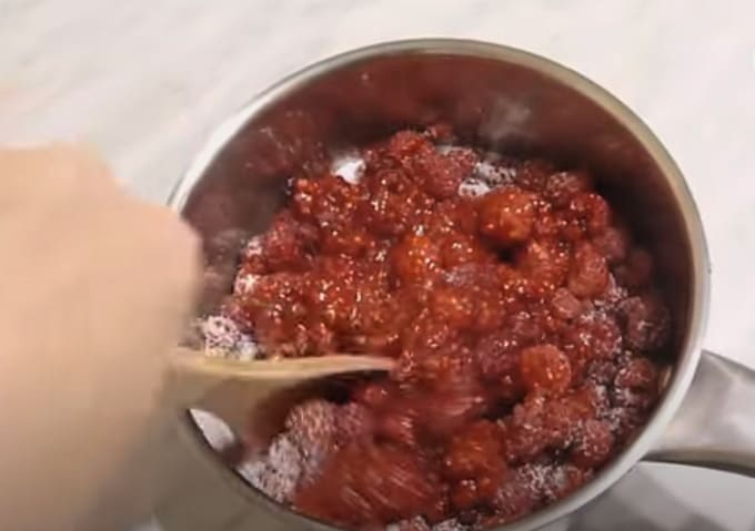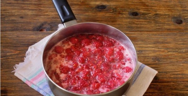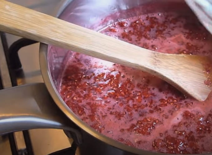 - We zetten de jam op een vuurtje tot de suikerkorrels oplossen. Roer in dit stadium een paar keer heel voorzichtig.Zodra de frambozenmassa kookt, zet je het vuur hoger en kook je 5 minuten. In deze periode is het niet aan te raden om je met de jam te bemoeien. Om te voorkomen dat de jam aanbrandt, schudt u de pan een beetje tijdens het koken. Als je toch wilt mixen - dat kan, maar heel voorzichtig en alleen met een houten spatel. Vergeet niet het schuim te verwijderen, omdat dit de jam kan oxideren.