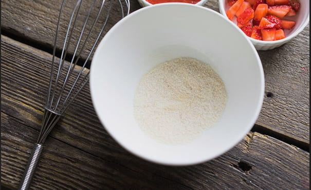 - Combineer de pectine en suiker in een droge kom en roer. Het is erg belangrijk om dit te doen, zodat de pectine geen klontjes vormt als het aan de jam wordt toegevoegd.