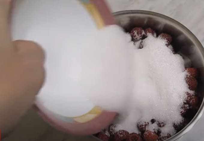 - We sorteren de frambozen zorgvuldig, maken ze schoon van alles wat overbodig is en spoelen ze af, geven de tijd om te drogen. We plaatsen alle bessen in een kom om jam te maken. Giet er suiker en citroenzuur bovenop - het helpt de mooie kleur van de traktatie te behouden en zal dienen als een extra conserveermiddel.