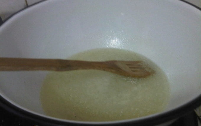 - Eerst koken we de siroop, hiervoor verdunnen we de suiker in water en koken tot de suiker volledig is opgelost in een geëmailleerde kom.