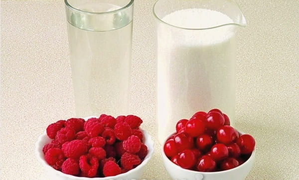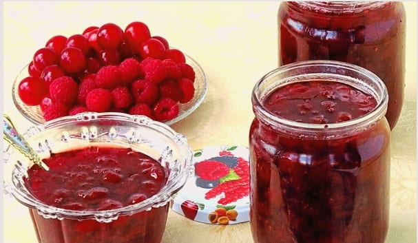 We zullen de jam in verschillende fasen bereiden, de bessen worden op verschillende manieren bereid, maar hun combinatie in één recept is gewoonweg heerlijk! De kersen blijven intact, de jam is dik, heeft een kersensmaak en een frambozensmaak.