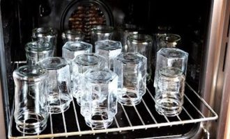 - Spoel potten en deksels af met soda, spoel af. Kook de deksels 5 minuten, steriliseer de potten in de oven of multicooker.