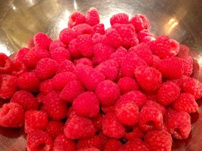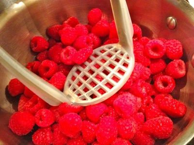 Breng een mengsel van frambozen en water aan de kook op middelhoog vuur en kook 5 minuten, al roerend en afromen. Haal de pan van het vuur en laat het mengsel iets afkoelen.