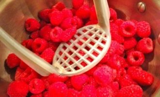 - Sorteer frambozen van puin, beschadigde, rotte en onrijpe bessen. Maal in een grote kom met behulp van een aardappelpuree stamper.
