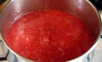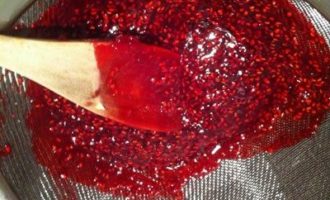 Doe de massa in een zeefset op een schone pan, maal de frambozen fijn met een houten spatel, een eetlepel of een siliconenspatel. De cake kan verder worden gebruikt bij het koken van compote, maar er moet suiker aan de bessenpuree worden toegevoegd.
