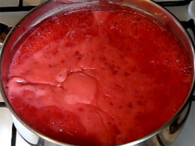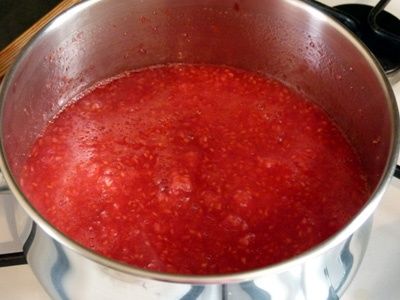 - Bedek de frambozen met suiker en voeg water toe. Kook zo'n mengsel op middelhoog vuur en kook dan ongeveer een half uur, onder voortdurend roeren en het schuim verwijderen met een lepel.