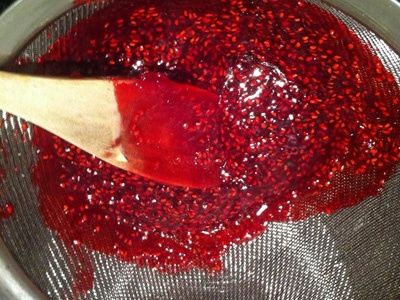 - Pons de massa meerdere keren met een blender om maximale homogeniteit te bereiken. Bedek de zeef met in vieren gevouwen gaas. Doe frambozenpuree in porties in het kaasdoek, draai het en knijp het met je handen door het kaasdoek. Gooi de taart weg.