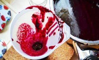 - Vouw de kaasdoek meerdere keren op een zeef, doe de bessenpuree in porties en druk met je handen aan, waarbij je de botten weggooit die binnen blijven. Van anderhalve kg bessen zal het uitkomen, ergens rond de 800 g kant-en-klare puree.