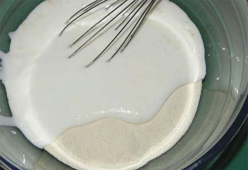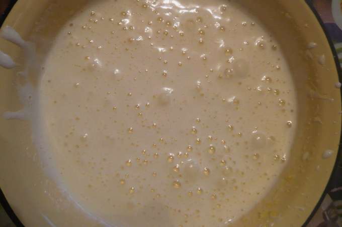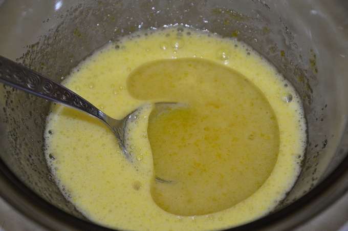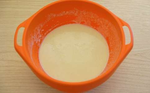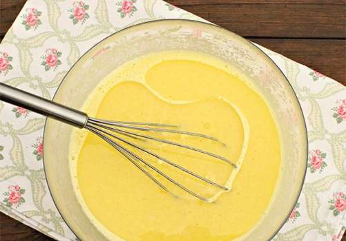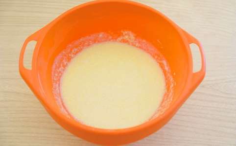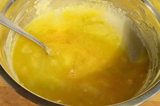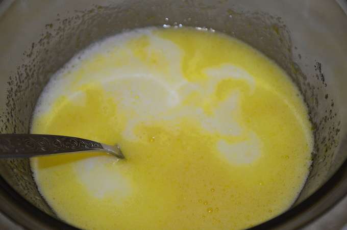 - Verwarm melk tot 33-36 graden, voeg dan boter toe en meng deze ingrediënten. Meng melk en eiermassa.