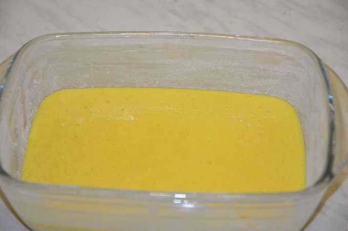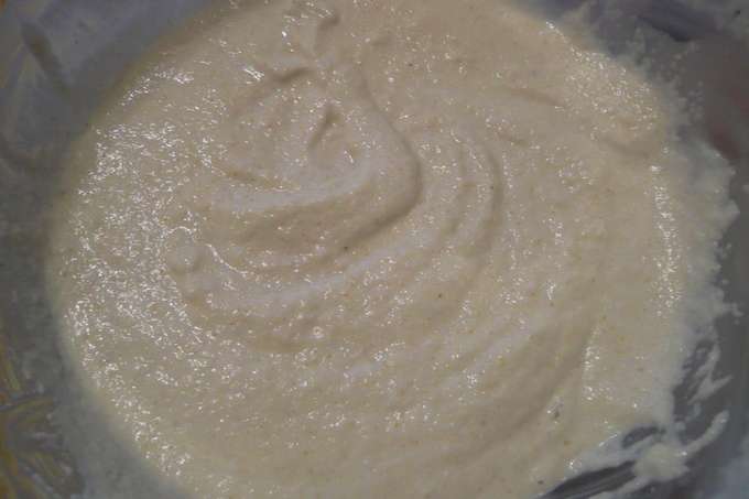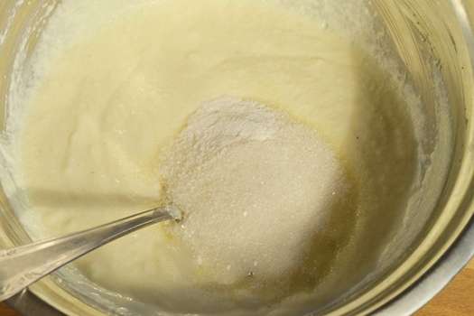 - Voeg suiker, zout en bakpoeder toe aan het gezwollen griesmeel, meng goed.
