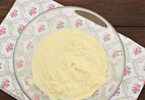 - Giet griesmeel in een kom en roer tot een gladde massa. Laat het deeg 20-30 minuten staan.