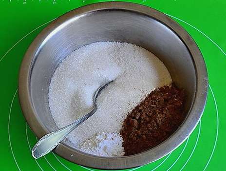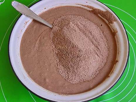- Alle droge ingrediënten: griesmeel, suiker, cacao, vanillesuiker en bakpoeder, giet in een aparte container, roer.