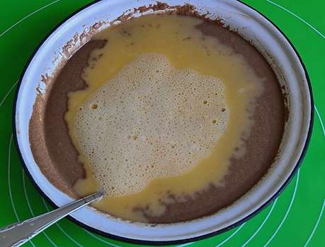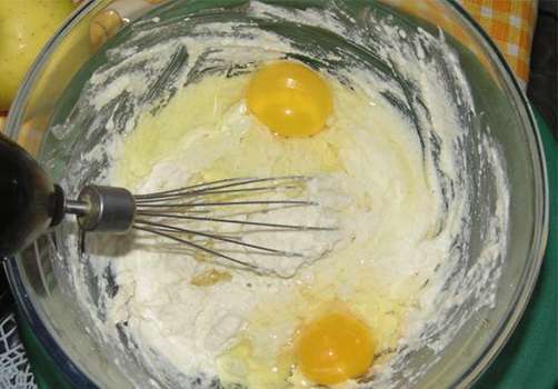 - Klop de eieren in een aparte kom, voeg dan de geklopte massa toe aan het deeg, meng.