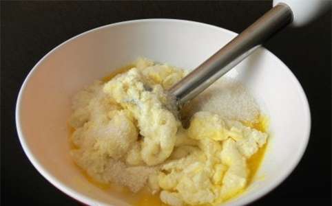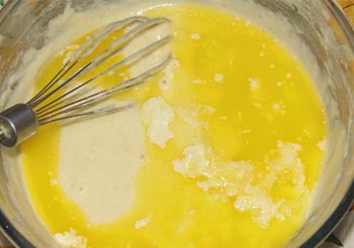 - Smelt de boter in de magnetron of het waterbad. Voeg afgekoelde boter toe aan losgeklopte eieren, roer. Voeg vervolgens het gezwollen griesmeel toe aan de kom.
